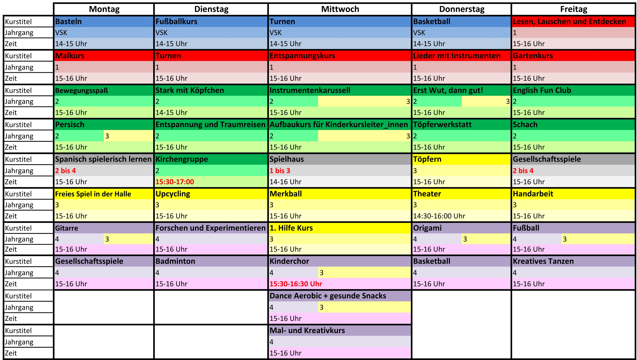 Kursangebote für das 1. Schulhalbjahr 25/26 – Wochenübersicht